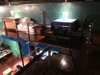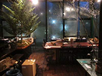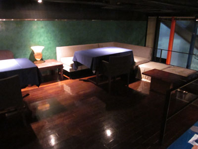遮りのないフロアと高い天井で撮影のバリエーションが豊富。 壁面の窓は全面磨りガラスで、採光ははいるが、外から見えなくなってます。 壁は濃い緑色で統一され、中央には季節の木々が展示されている不思議な空間。高い位置にあるロフト席はソファー席となります。